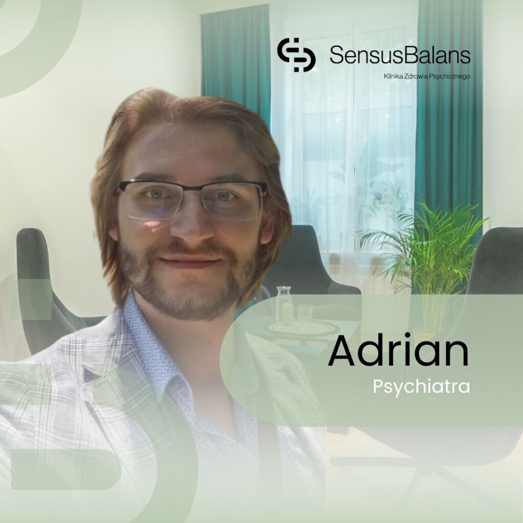 Nazywam się Adrian. Jestem lekarzem psychiatrą. Ukończyłem Wrocławski Uniwersytet Medyczny, a staż podyplomowy odbywałem w Uniwersyteckim Szpitalu Klinicznym oraz w 4. Wojskowym Szpitalu Klinicznym z Polikliniką we Wrocławiu. Szkolenie specjalizacyjne w dziedzinie psychiatrii realizowałem w Dolnośląskim Centrum Zdrowia Psychicznego. Zdobywałem doświadczenie, pracując na oddziałach psychiatrycznych stacjonarnych, dziennych oraz w ośrodkach leczenia uzależnień. W 2023 roku uzyskałem tytuł specjalisty psychiatrii.